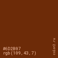 Цвет #6D2B07 в цветовой модели RGB обозначается тремя октетами (109, 43, 7) в десятичном формате и #6D2B07 в шестнадцатиричном (hex) формате, которые являются интенсивностью красного 109 (hex 6D), интенсивность зелёного 43 (hex 2B) и интенсивность синего 7 (hex 07).