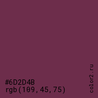 Цвет #6D2D4B в цветовой модели RGB обозначается тремя октетами (109, 45, 75) в десятичном формате и #6D2D4B в шестнадцатиричном (hex) формате, которые являются интенсивностью красного 109 (hex 6D), интенсивность зелёного 45 (hex 2D) и интенсивность синего 75 (hex 4B).
