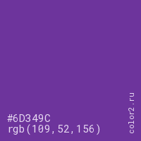 Цвет #6D349C в цветовой модели RGB обозначается тремя октетами (109, 52, 156) в десятичном формате и #6D349C в шестнадцатиричном (hex) формате, которые являются интенсивностью красного 109 (hex 6D), интенсивность зелёного 52 (hex 34) и интенсивность синего 156 (hex 9C).