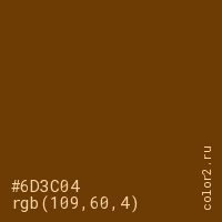 Цвет #6D3C04 в цветовой модели RGB обозначается тремя октетами (109, 60, 4) в десятичном формате и #6D3C04 в шестнадцатиричном (hex) формате, которые являются интенсивностью красного 109 (hex 6D), интенсивность зелёного 60 (hex 3C) и интенсивность синего 4 (hex 04).