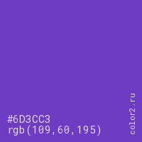 Цвет #6D3CC3 в цветовой модели RGB обозначается тремя октетами (109, 60, 195) в десятичном формате и #6D3CC3 в шестнадцатиричном (hex) формате, которые являются интенсивностью красного 109 (hex 6D), интенсивность зелёного 60 (hex 3C) и интенсивность синего 195 (hex C3).