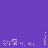 Цвет #6D3DC2 в цветовой модели RGB обозначается тремя октетами (109, 61, 194) в десятичном формате и #6D3DC2 в шестнадцатиричном (hex) формате, которые являются интенсивностью красного 109 (hex 6D), интенсивность зелёного 61 (hex 3D) и интенсивность синего 194 (hex C2).