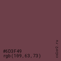 Цвет #6D3F49 в цветовой модели RGB обозначается тремя октетами (109, 63, 73) в десятичном формате и #6D3F49 в шестнадцатиричном (hex) формате, которые являются интенсивностью красного 109 (hex 6D), интенсивность зелёного 63 (hex 3F) и интенсивность синего 73 (hex 49).