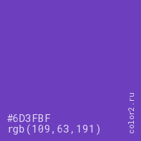Цвет #6D3FBF в цветовой модели RGB обозначается тремя октетами (109, 63, 191) в десятичном формате и #6D3FBF в шестнадцатиричном (hex) формате, которые являются интенсивностью красного 109 (hex 6D), интенсивность зелёного 63 (hex 3F) и интенсивность синего 191 (hex BF).
