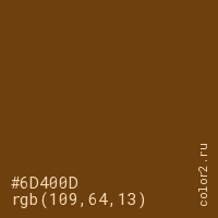 Цвет #6D400D в цветовой модели RGB обозначается тремя октетами (109, 64, 13) в десятичном формате и #6D400D в шестнадцатиричном (hex) формате, которые являются интенсивностью красного 109 (hex 6D), интенсивность зелёного 64 (hex 40) и интенсивность синего 13 (hex 0D).