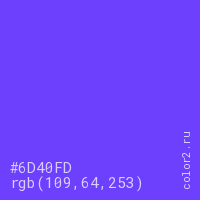 Цвет #6D40FD в цветовой модели RGB обозначается тремя октетами (109, 64, 253) в десятичном формате и #6D40FD в шестнадцатиричном (hex) формате, которые являются интенсивностью красного 109 (hex 6D), интенсивность зелёного 64 (hex 40) и интенсивность синего 253 (hex FD).