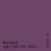 Цвет #6D4569 в цветовой модели RGB обозначается тремя октетами (109, 69, 105) в десятичном формате и #6D4569 в шестнадцатиричном (hex) формате, которые являются интенсивностью красного 109 (hex 6D), интенсивность зелёного 69 (hex 45) и интенсивность синего 105 (hex 69).