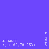 Цвет #6D46FD в цветовой модели RGB обозначается тремя октетами (109, 70, 253) в десятичном формате и #6D46FD в шестнадцатиричном (hex) формате, которые являются интенсивностью красного 109 (hex 6D), интенсивность зелёного 70 (hex 46) и интенсивность синего 253 (hex FD).