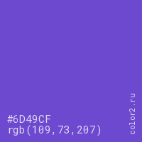 Цвет #6D49CF в цветовой модели RGB обозначается тремя октетами (109, 73, 207) в десятичном формате и #6D49CF в шестнадцатиричном (hex) формате, которые являются интенсивностью красного 109 (hex 6D), интенсивность зелёного 73 (hex 49) и интенсивность синего 207 (hex CF).