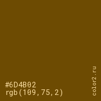 Цвет #6D4B02 в цветовой модели RGB обозначается тремя октетами (109, 75, 2) в десятичном формате и #6D4B02 в шестнадцатиричном (hex) формате, которые являются интенсивностью красного 109 (hex 6D), интенсивность зелёного 75 (hex 4B) и интенсивность синего 2 (hex 02).