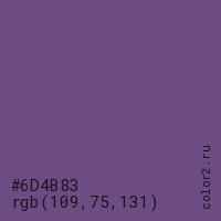 Цвет #6D4B83 в цветовой модели RGB обозначается тремя октетами (109, 75, 131) в десятичном формате и #6D4B83 в шестнадцатиричном (hex) формате, которые являются интенсивностью красного 109 (hex 6D), интенсивность зелёного 75 (hex 4B) и интенсивность синего 131 (hex 83).