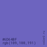 Цвет #6D64BF в цветовой модели RGB обозначается тремя октетами (109, 100, 191) в десятичном формате и #6D64BF в шестнадцатиричном (hex) формате, которые являются интенсивностью красного 109 (hex 6D), интенсивность зелёного 100 (hex 64) и интенсивность синего 191 (hex BF).
