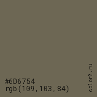 Цвет #6D6754 в цветовой модели RGB обозначается тремя октетами (109, 103, 84) в десятичном формате и #6D6754 в шестнадцатиричном (hex) формате, которые являются интенсивностью красного 109 (hex 6D), интенсивность зелёного 103 (hex 67) и интенсивность синего 84 (hex 54).