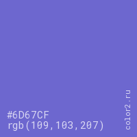 Цвет #6D67CF в цветовой модели RGB обозначается тремя октетами (109, 103, 207) в десятичном формате и #6D67CF в шестнадцатиричном (hex) формате, которые являются интенсивностью красного 109 (hex 6D), интенсивность зелёного 103 (hex 67) и интенсивность синего 207 (hex CF).
