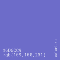 Цвет #6D6CC9 в цветовой модели RGB обозначается тремя октетами (109, 108, 201) в десятичном формате и #6D6CC9 в шестнадцатиричном (hex) формате, которые являются интенсивностью красного 109 (hex 6D), интенсивность зелёного 108 (hex 6C) и интенсивность синего 201 (hex C9).
