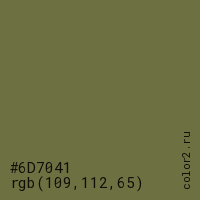 Цвет #6D7041 в цветовой модели RGB обозначается тремя октетами (109, 112, 65) в десятичном формате и #6D7041 в шестнадцатиричном (hex) формате, которые являются интенсивностью красного 109 (hex 6D), интенсивность зелёного 112 (hex 70) и интенсивность синего 65 (hex 41).