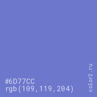 Цвет #6D77CC в цветовой модели RGB обозначается тремя октетами (109, 119, 204) в десятичном формате и #6D77CC в шестнадцатиричном (hex) формате, которые являются интенсивностью красного 109 (hex 6D), интенсивность зелёного 119 (hex 77) и интенсивность синего 204 (hex CC).