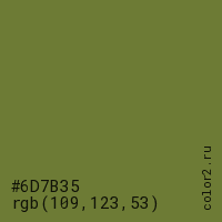 Цвет #6D7B35 в цветовой модели RGB обозначается тремя октетами (109, 123, 53) в десятичном формате и #6D7B35 в шестнадцатиричном (hex) формате, которые являются интенсивностью красного 109 (hex 6D), интенсивность зелёного 123 (hex 7B) и интенсивность синего 53 (hex 35).