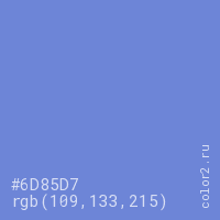 Цвет #6D85D7 в цветовой модели RGB обозначается тремя октетами (109, 133, 215) в десятичном формате и #6D85D7 в шестнадцатиричном (hex) формате, которые являются интенсивностью красного 109 (hex 6D), интенсивность зелёного 133 (hex 85) и интенсивность синего 215 (hex D7).
