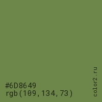 Цвет #6D8649 в цветовой модели RGB обозначается тремя октетами (109, 134, 73) в десятичном формате и #6D8649 в шестнадцатиричном (hex) формате, которые являются интенсивностью красного 109 (hex 6D), интенсивность зелёного 134 (hex 86) и интенсивность синего 73 (hex 49).