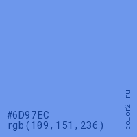 Цвет #6D97EC в цветовой модели RGB обозначается тремя октетами (109, 151, 236) в десятичном формате и #6D97EC в шестнадцатиричном (hex) формате, которые являются интенсивностью красного 109 (hex 6D), интенсивность зелёного 151 (hex 97) и интенсивность синего 236 (hex EC).