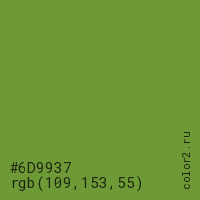 Цвет #6D9937 в цветовой модели RGB обозначается тремя октетами (109, 153, 55) в десятичном формате и #6D9937 в шестнадцатиричном (hex) формате, которые являются интенсивностью красного 109 (hex 6D), интенсивность зелёного 153 (hex 99) и интенсивность синего 55 (hex 37).