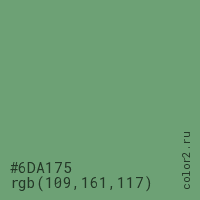 Цвет #6DA175 в цветовой модели RGB обозначается тремя октетами (109, 161, 117) в десятичном формате и #6DA175 в шестнадцатиричном (hex) формате, которые являются интенсивностью красного 109 (hex 6D), интенсивность зелёного 161 (hex A1) и интенсивность синего 117 (hex 75).