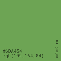 Цвет #6DA454 в цветовой модели RGB обозначается тремя октетами (109, 164, 84) в десятичном формате и #6DA454 в шестнадцатиричном (hex) формате, которые являются интенсивностью красного 109 (hex 6D), интенсивность зелёного 164 (hex A4) и интенсивность синего 84 (hex 54).
