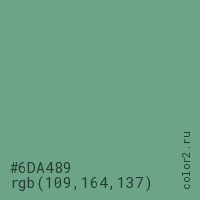 Цвет #6DA489 в цветовой модели RGB обозначается тремя октетами (109, 164, 137) в десятичном формате и #6DA489 в шестнадцатиричном (hex) формате, которые являются интенсивностью красного 109 (hex 6D), интенсивность зелёного 164 (hex A4) и интенсивность синего 137 (hex 89).