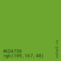 Цвет #6DA730 в цветовой модели RGB обозначается тремя октетами (109, 167, 48) в десятичном формате и #6DA730 в шестнадцатиричном (hex) формате, которые являются интенсивностью красного 109 (hex 6D), интенсивность зелёного 167 (hex A7) и интенсивность синего 48 (hex 30).