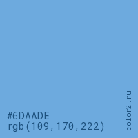 Цвет #6DAADE в цветовой модели RGB обозначается тремя октетами (109, 170, 222) в десятичном формате и #6DAADE в шестнадцатиричном (hex) формате, которые являются интенсивностью красного 109 (hex 6D), интенсивность зелёного 170 (hex AA) и интенсивность синего 222 (hex DE).