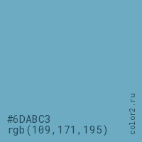 Цвет #6DABC3 в цветовой модели RGB обозначается тремя октетами (109, 171, 195) в десятичном формате и #6DABC3 в шестнадцатиричном (hex) формате, которые являются интенсивностью красного 109 (hex 6D), интенсивность зелёного 171 (hex AB) и интенсивность синего 195 (hex C3).