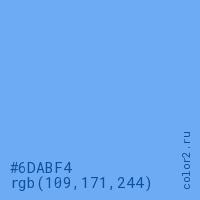 Цвет #6DABF4 в цветовой модели RGB обозначается тремя октетами (109, 171, 244) в десятичном формате и #6DABF4 в шестнадцатиричном (hex) формате, которые являются интенсивностью красного 109 (hex 6D), интенсивность зелёного 171 (hex AB) и интенсивность синего 244 (hex F4).