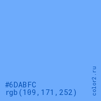 Цвет #6DABFC в цветовой модели RGB обозначается тремя октетами (109, 171, 252) в десятичном формате и #6DABFC в шестнадцатиричном (hex) формате, которые являются интенсивностью красного 109 (hex 6D), интенсивность зелёного 171 (hex AB) и интенсивность синего 252 (hex FC).