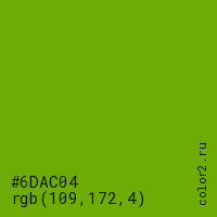 Цвет #6DAC04 в цветовой модели RGB обозначается тремя октетами (109, 172, 4) в десятичном формате и #6DAC04 в шестнадцатиричном (hex) формате, которые являются интенсивностью красного 109 (hex 6D), интенсивность зелёного 172 (hex AC) и интенсивность синего 4 (hex 04).