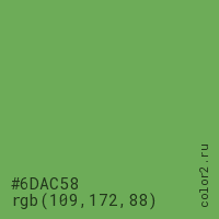 Цвет #6DAC58 в цветовой модели RGB обозначается тремя октетами (109, 172, 88) в десятичном формате и #6DAC58 в шестнадцатиричном (hex) формате, которые являются интенсивностью красного 109 (hex 6D), интенсивность зелёного 172 (hex AC) и интенсивность синего 88 (hex 58).