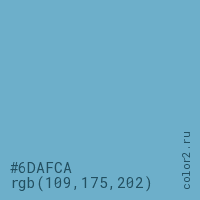 Цвет RGB(109, 175, 202) в процентом отношении количества цвета состоит из 42.7% красного (red), 68.6% зелёного (green) и 79.2% синего (blue).