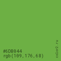 Цвет #6DB044 в цветовой модели RGB обозначается тремя октетами (109, 176, 68) в десятичном формате и #6DB044 в шестнадцатиричном (hex) формате, которые являются интенсивностью красного 109 (hex 6D), интенсивность зелёного 176 (hex B0) и интенсивность синего 68 (hex 44).
