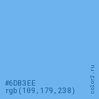 Цвет #6DB3EE в цветовой модели RGB обозначается тремя октетами (109, 179, 238) в десятичном формате и #6DB3EE в шестнадцатиричном (hex) формате, которые являются интенсивностью красного 109 (hex 6D), интенсивность зелёного 179 (hex B3) и интенсивность синего 238 (hex EE).
