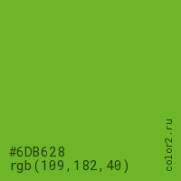 Цвет #6DB628 в цветовой модели RGB обозначается тремя октетами (109, 182, 40) в десятичном формате и #6DB628 в шестнадцатиричном (hex) формате, которые являются интенсивностью красного 109 (hex 6D), интенсивность зелёного 182 (hex B6) и интенсивность синего 40 (hex 28).