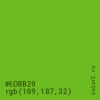 Цвет #6DBB20 в цветовой модели RGB обозначается тремя октетами (109, 187, 32) в десятичном формате и #6DBB20 в шестнадцатиричном (hex) формате, которые являются интенсивностью красного 109 (hex 6D), интенсивность зелёного 187 (hex BB) и интенсивность синего 32 (hex 20).