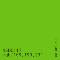 Цвет #6DC117 в цветовой модели RGB обозначается тремя октетами (109, 193, 23) в десятичном формате и #6DC117 в шестнадцатиричном (hex) формате, которые являются интенсивностью красного 109 (hex 6D), интенсивность зелёного 193 (hex C1) и интенсивность синего 23 (hex 17).