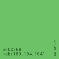 Цвет #6DC268 в цветовой модели RGB обозначается тремя октетами (109, 194, 104) в десятичном формате и #6DC268 в шестнадцатиричном (hex) формате, которые являются интенсивностью красного 109 (hex 6D), интенсивность зелёного 194 (hex C2) и интенсивность синего 104 (hex 68).