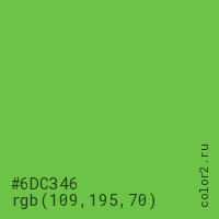 Цвет #6DC346 в цветовой модели RGB обозначается тремя октетами (109, 195, 70) в десятичном формате и #6DC346 в шестнадцатиричном (hex) формате, которые являются интенсивностью красного 109 (hex 6D), интенсивность зелёного 195 (hex C3) и интенсивность синего 70 (hex 46).