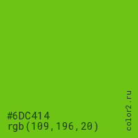 Цвет #6DC414 в цветовой модели RGB обозначается тремя октетами (109, 196, 20) в десятичном формате и #6DC414 в шестнадцатиричном (hex) формате, которые являются интенсивностью красного 109 (hex 6D), интенсивность зелёного 196 (hex C4) и интенсивность синего 20 (hex 14).