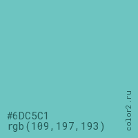 Цвет #6DC5C1 в цветовой модели RGB обозначается тремя октетами (109, 197, 193) в десятичном формате и #6DC5C1 в шестнадцатиричном (hex) формате, которые являются интенсивностью красного 109 (hex 6D), интенсивность зелёного 197 (hex C5) и интенсивность синего 193 (hex C1).