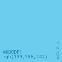 Цвет #6DCDF1 в цветовой модели RGB обозначается тремя октетами (109, 205, 241) в десятичном формате и #6DCDF1 в шестнадцатиричном (hex) формате, которые являются интенсивностью красного 109 (hex 6D), интенсивность зелёного 205 (hex CD) и интенсивность синего 241 (hex F1).