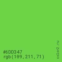Цвет #6DD347 в цветовой модели RGB обозначается тремя октетами (109, 211, 71) в десятичном формате и #6DD347 в шестнадцатиричном (hex) формате, которые являются интенсивностью красного 109 (hex 6D), интенсивность зелёного 211 (hex D3) и интенсивность синего 71 (hex 47).