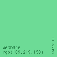 Цвет #6DDB96 в цветовой модели RGB обозначается тремя октетами (109, 219, 150) в десятичном формате и #6DDB96 в шестнадцатиричном (hex) формате, которые являются интенсивностью красного 109 (hex 6D), интенсивность зелёного 219 (hex DB) и интенсивность синего 150 (hex 96).