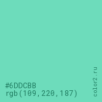 Цвет #6DDCBB в цветовой модели RGB обозначается тремя октетами (109, 220, 187) в десятичном формате и #6DDCBB в шестнадцатиричном (hex) формате, которые являются интенсивностью красного 109 (hex 6D), интенсивность зелёного 220 (hex DC) и интенсивность синего 187 (hex BB).